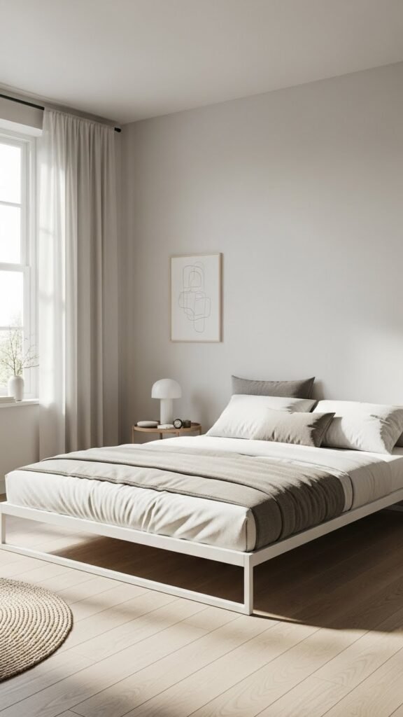 You’ll favor a sleek platform and a minimal headboard to preserve openness, pair low bedding and pared accents, and keep movement and light unobstructed for a liberated, calm retreat.