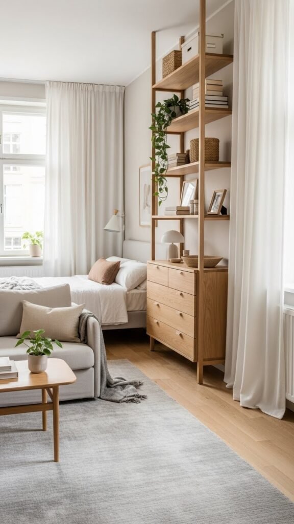 Once you’ve lifted the eye with tall headboards or floor-to-ceiling curtains, use furniture placement and rugs to define functional zones within the same small space. Anchor a reading nook with purposeful rug placement, orient seating to create clear furniture flow, and keep pathways open. Choose scaled pieces that suggest separate activities without walls, so you feel free and uncluttered.
