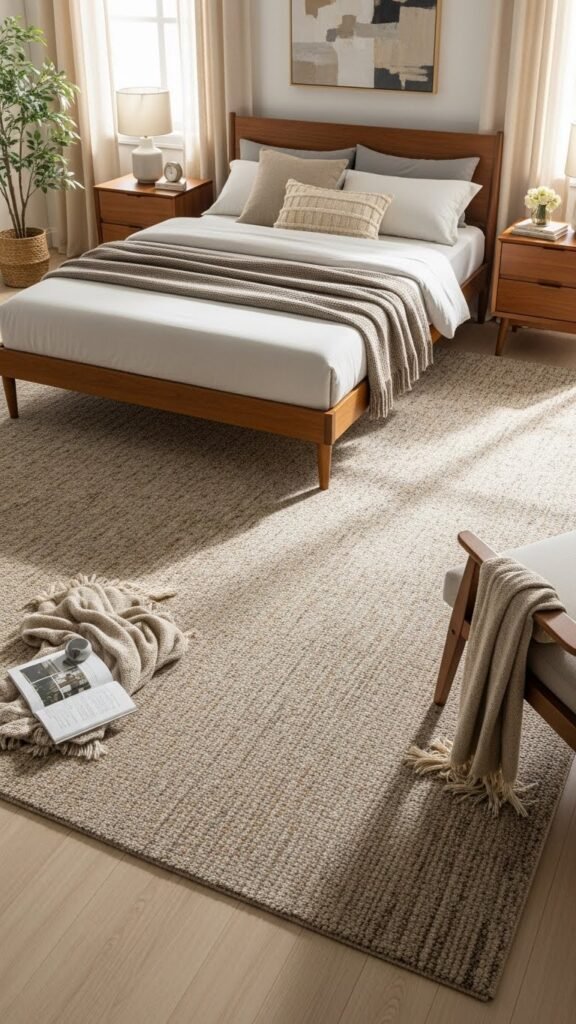 One strong rug can instantly pull the room together, so pick one dominant piece that sets the palette, scale, and mood—think proportion, texture, and color that complement your bed and furniture. Choose a rug that defines zones, aids color coordination, and balances scale. Let rug texture add warmth and freedom to move; keep other textiles restrained so the floor remains your focal anchor.