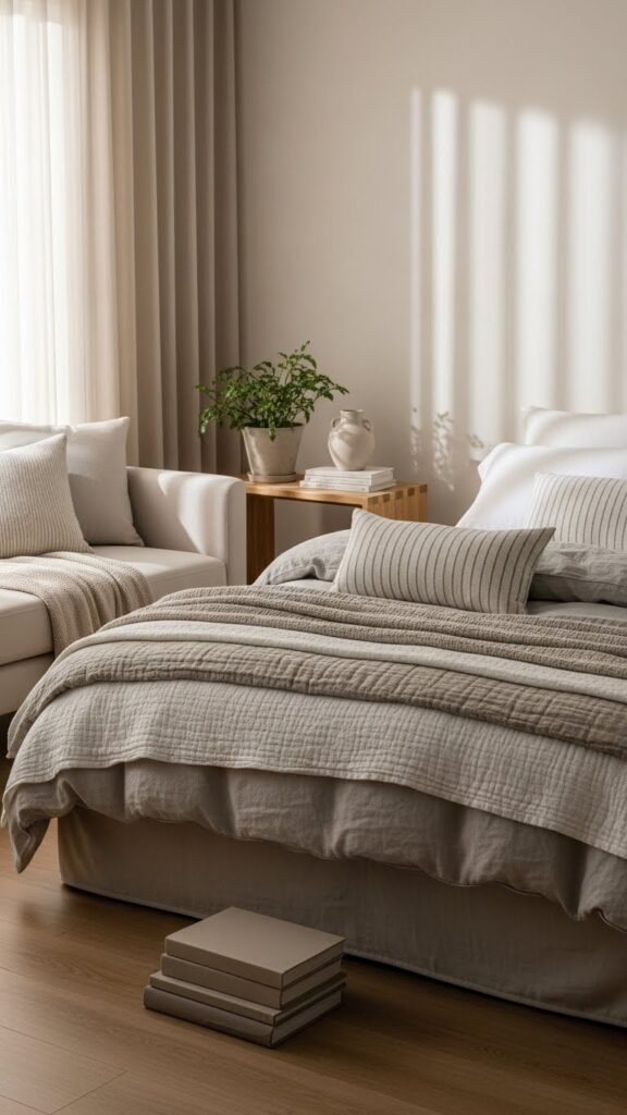After keeping large pieces calm with solids and subtle textures, shift your focus to bedding that breathes rather than overwhelms. Choose linen textures and mix breathable layers—light quilts, cotton blankets, and a thin duvet or coverlet—to create depth without weight. You’ll enjoy a freer, airier room that’s easy to launder, flexible for seasons, and instantly feels more spacious and relaxed.