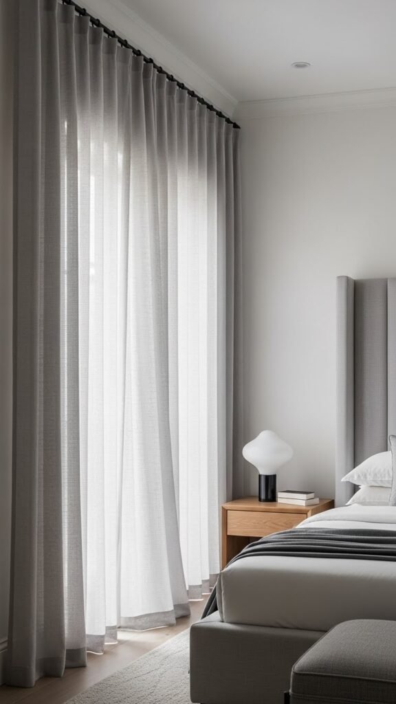 If you want to make a small bedroom feel taller, install a tall headboard or hang floor-to-ceiling curtains to draw the eye upward and add instant drama. Choose a headboard with vertical tufting to emphasize height, or select lightweight curtain panels that skim the floor for movement.