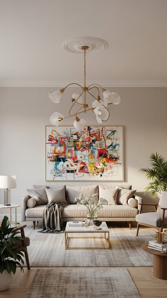 Pick one focal element—a statement artwork or an accent chandelier—and let everything else breathe.