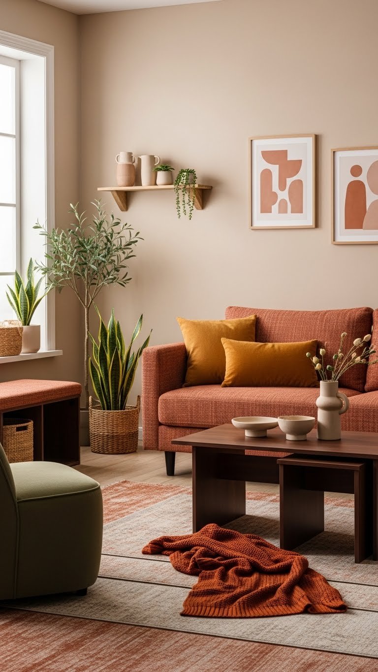 When you choose a warm earth-tone palette, you’re grounding your living room in timeless comfort that still feels modern—think clay, terracotta, olive, and warm beige layered with deep chocolate or rust accents.