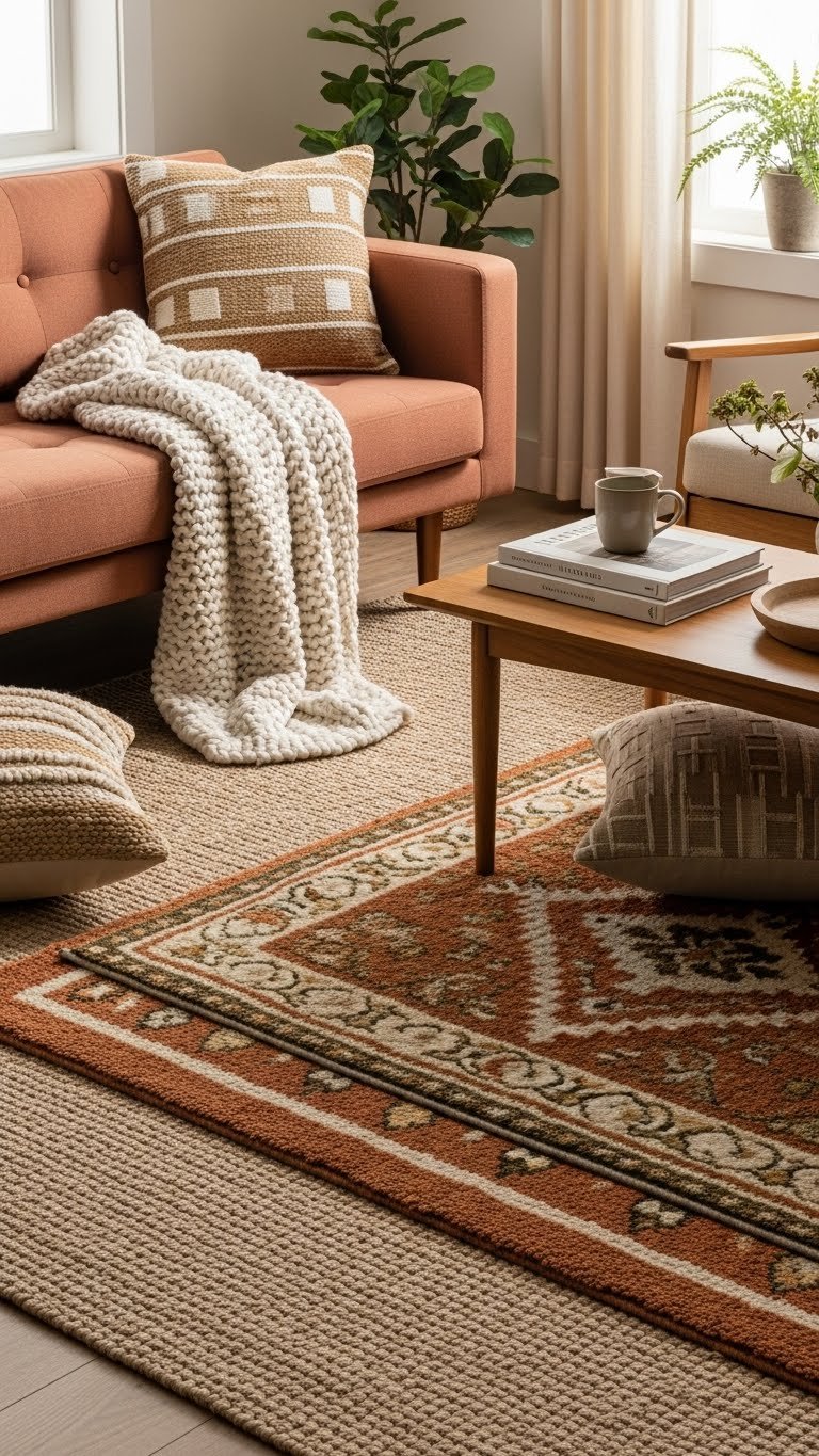 Although rugs and throws might seem like finishing touches, they’re the easiest way to add depth and personality to an earth-tone living room without repainting or replacing furniture. You’ll mix layered pile rugs for tactile contrast and anchor seating, then drape contrasting weave throws to introduce pattern and movement. Choose durable fibers, play with scale, and swap pieces seasonally to keep your space feeling free and fresh.