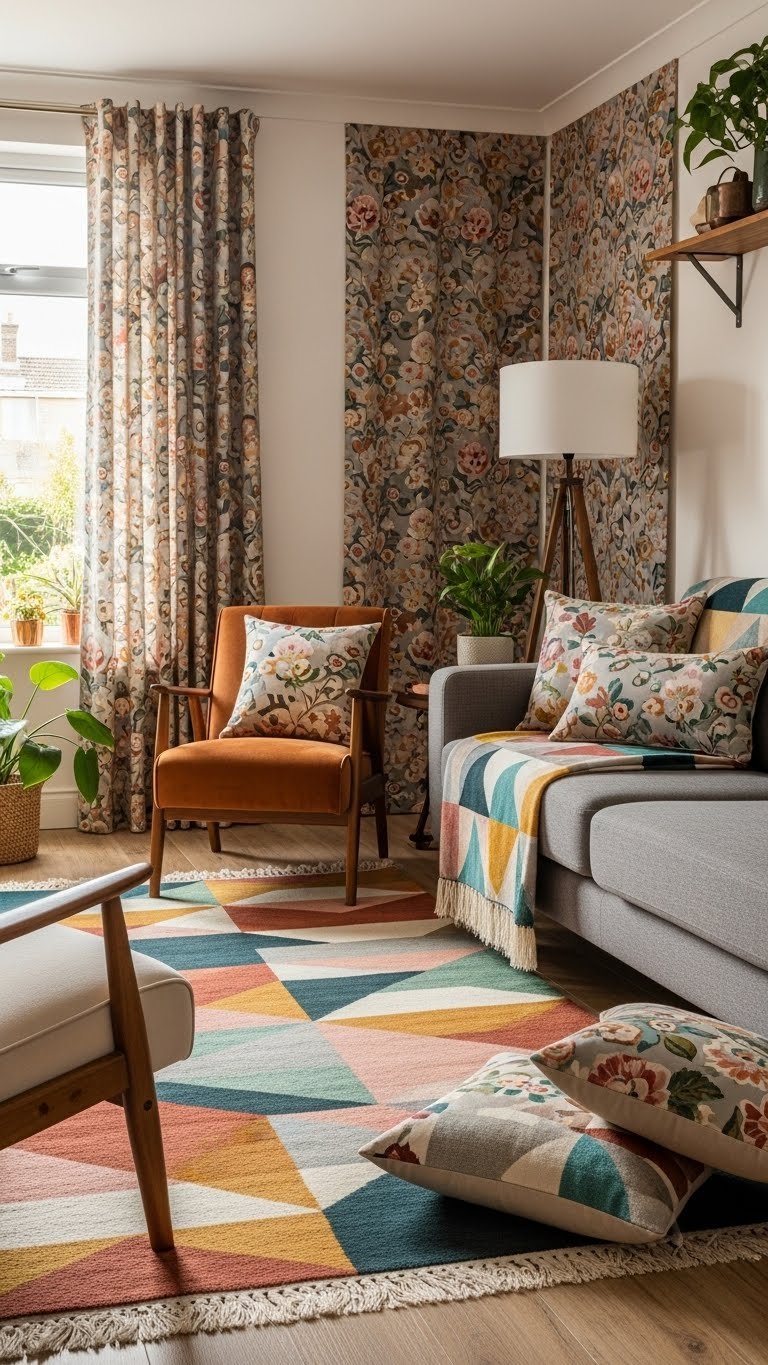 You’ll balance maximalist florals with bold geometrics—curtains, rugs, pillows—keeping a restrained palette so your bold choices feel liberating, intentional, and utterly you.
