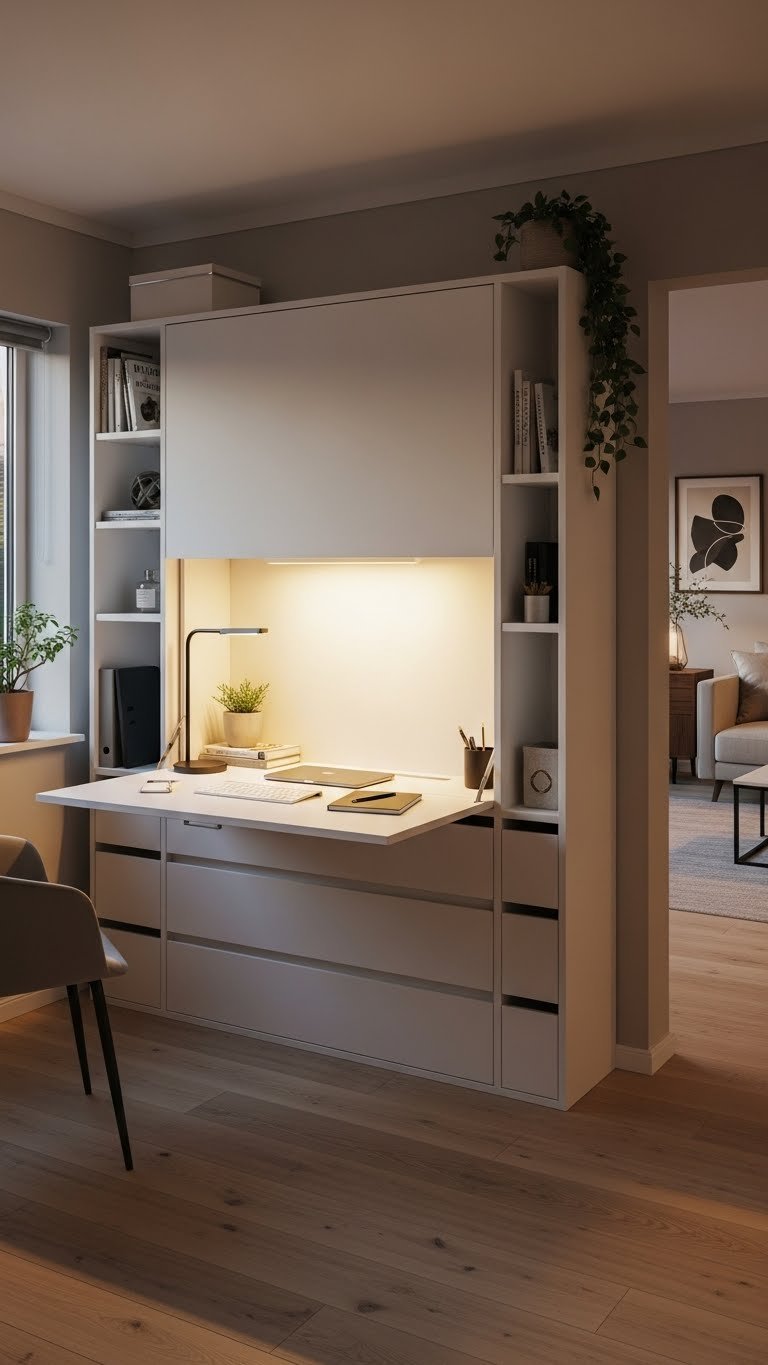 Fold away a full workstation by day and reveal a neat, compact desk by night—Murphy-style desks make small home offices feel deliberate, not cramped.