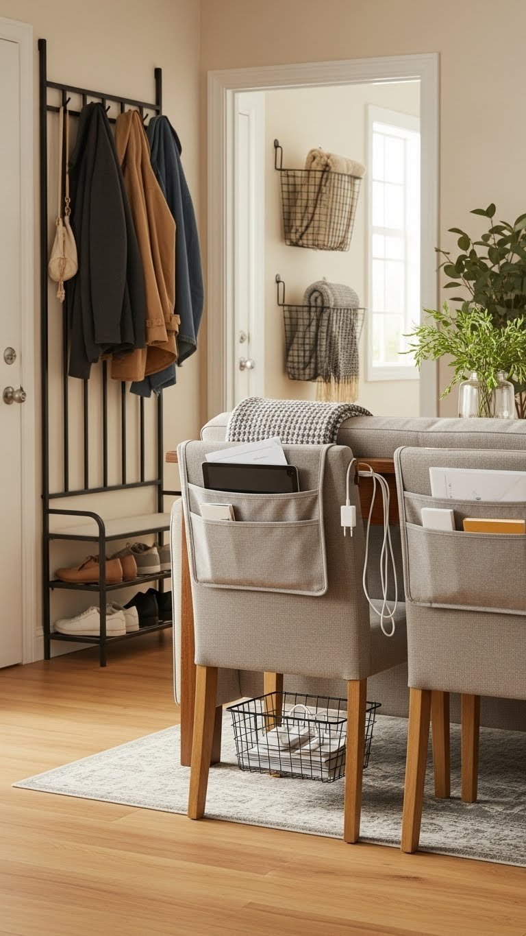 After you’ve lifted storage off the floor with vertical shelving, look above and behind seating to reclaim hidden real estate: over-door racks, slim shoe organizers, and hanging baskets on the back of chairs or sofas create accessible pockets for mail, chargers, throws, and shoes without crowding walkways.