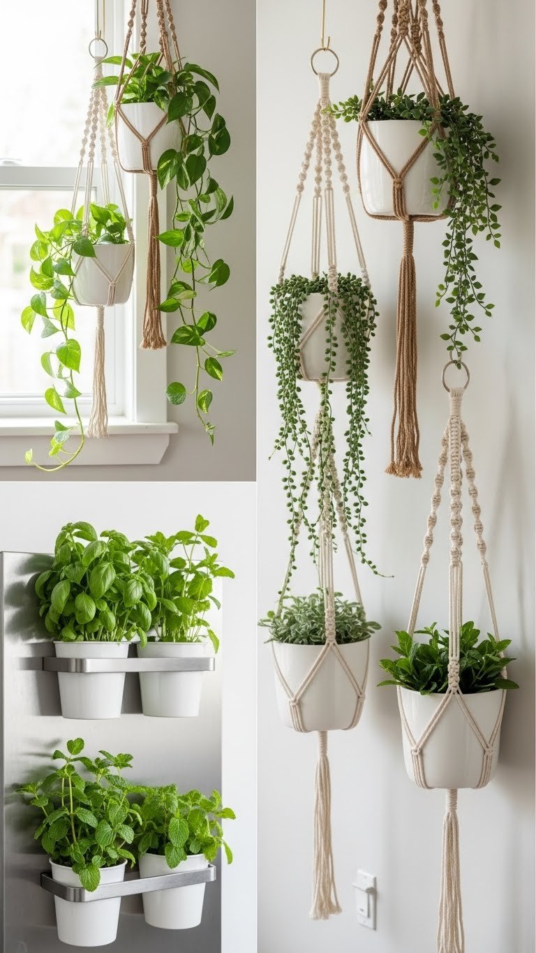 Hang a few lightweight planters to add life and texture to your walls without damaging them — a renter-friendly way to introduce greenery that feels intentional, not cluttered. You’ll choose macramé planters for boho flair or sleek ceramic pots on removable hooks. Try magnetic herbpots on metal surfaces for easy access and freedom to rearrange, keeping your space fresh and effortlessly curated.