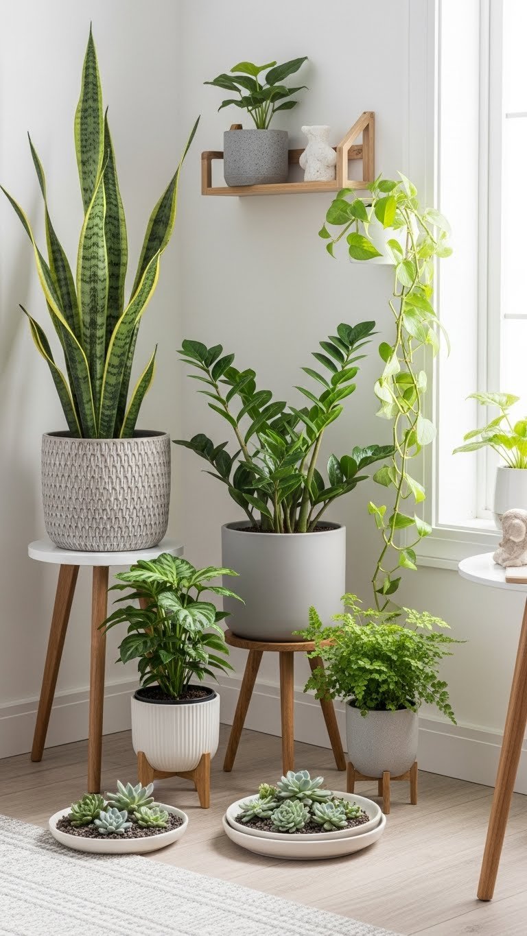 If you want greenery that’s fuss-free and fashionable, build a low-maintenance houseplant collection focused on resilient, rewarding varieties like snake plants, ZZ plants, pothos, and cast-iron ferns. You’ll choose pet friendly succulents, low light ferns, and easy-care pots that free you from constant watering. Mix sizes, use simple stands, and enjoy a calm, stylish green retreat without obligations.