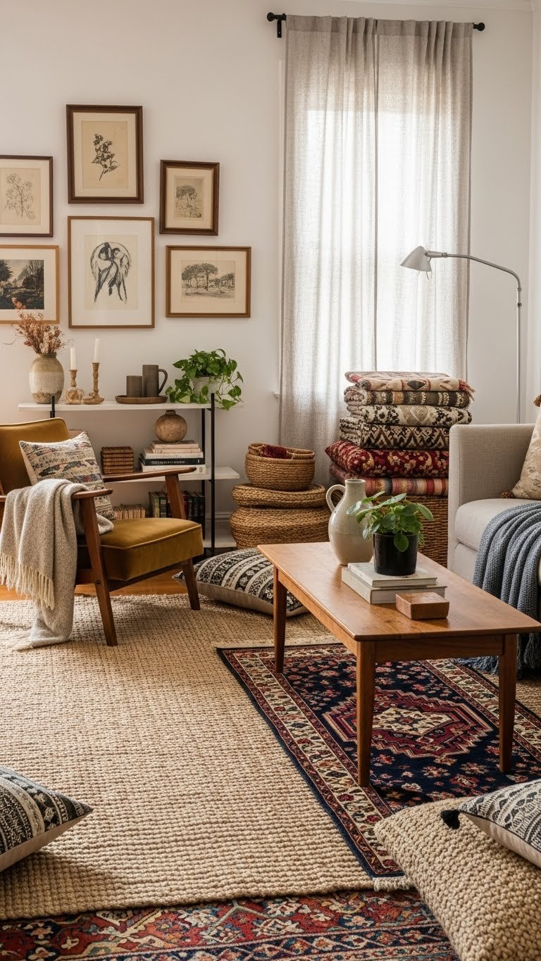 You’ll favor terracotta textiles and ochre accents to create cohesion, pick multifunctional furniture, balance light with matte finishes, and keep décor flexible so your space stays stylish and free.