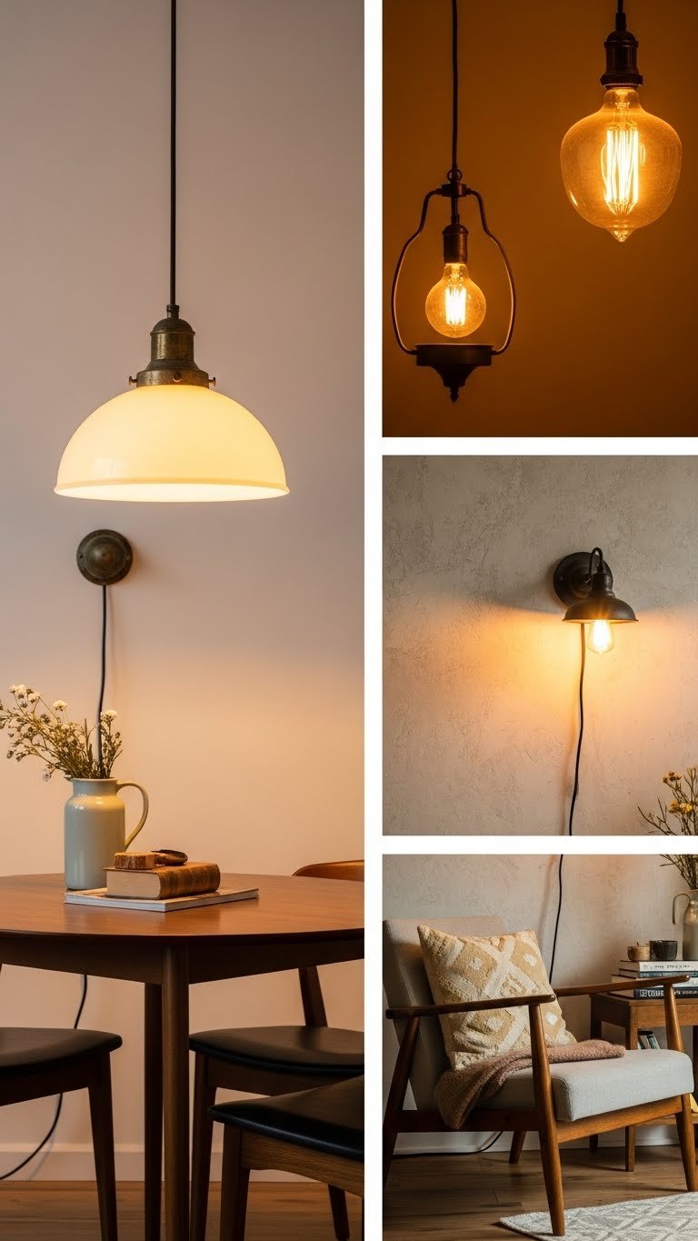 Elevate your rental’s personality with statement vintage lighting fixtures that act as functional art—think patinated brass pendants, opaline glass shades, or an industrial-era sconce hung above a reading nook. You can swap in antique pendants or filament chandeliers to define zones, boost warmth, and showcase your taste without permanent changes. Choose dimmable, renter-friendly fittings that feel personal and liberating.