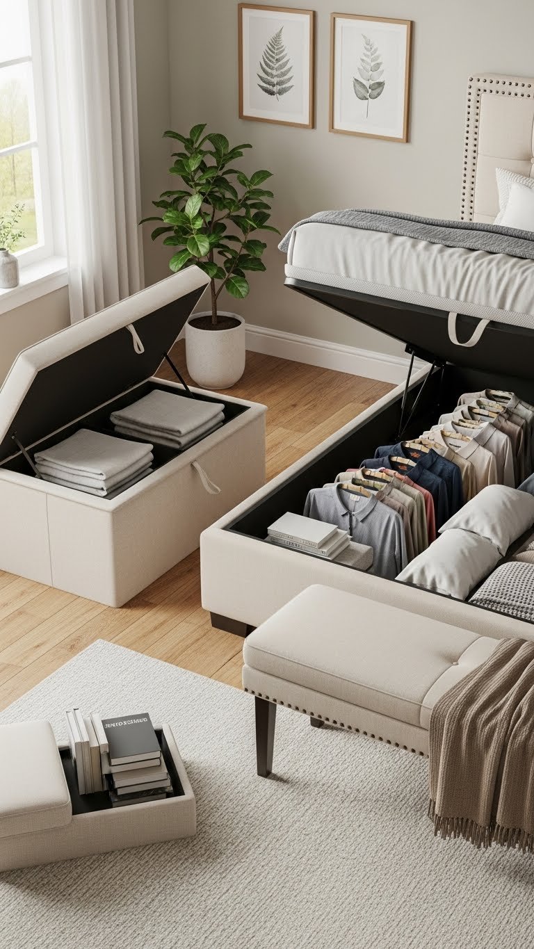 Bring in upholstered storage ottomans and beds to hide clutter and add tactile warmth without sacrificing style—you’ll get hidden compartments for linens, seasonal clothing, and living-room essentials while soft fabrics and tailored lines elevate the space.