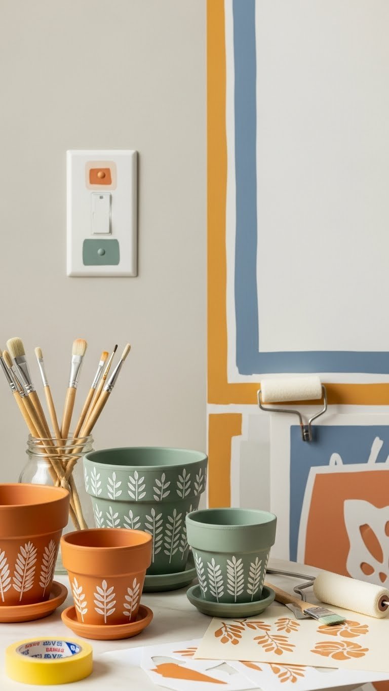 You can refresh hand painted switchplates, create a statement border on removable wallpaper, and craft stenciled plantpots for a cohesive look.