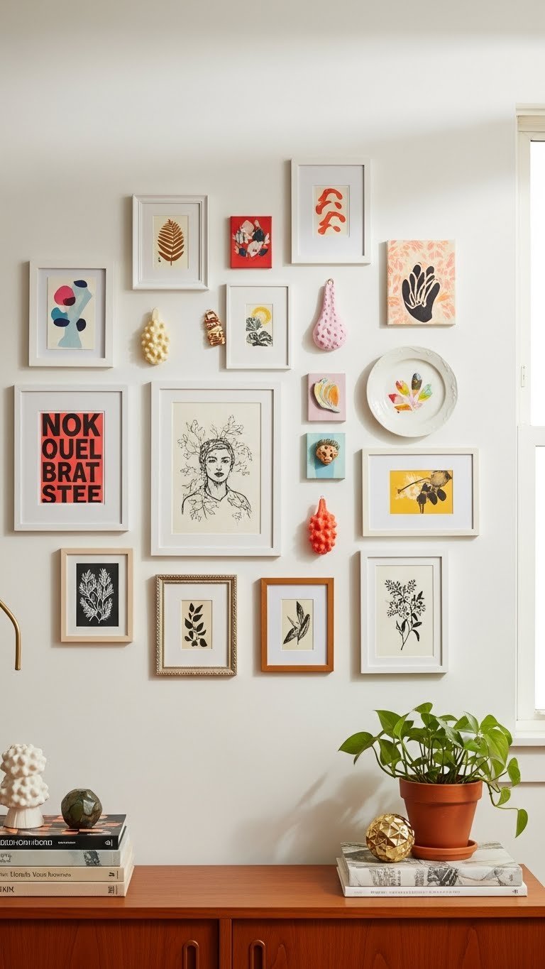 Hand-painted accents and stenciled pieces give your space personality — now think about how to display them. Curate gallery-style walls with mini frame arrangements and layered mat compositions to mix textures and scale. You’ll anchor a room by balancing bold prints, small paintings, and found objects. Keep layouts flexible so you can rearrange freely as your tastes evolve.
