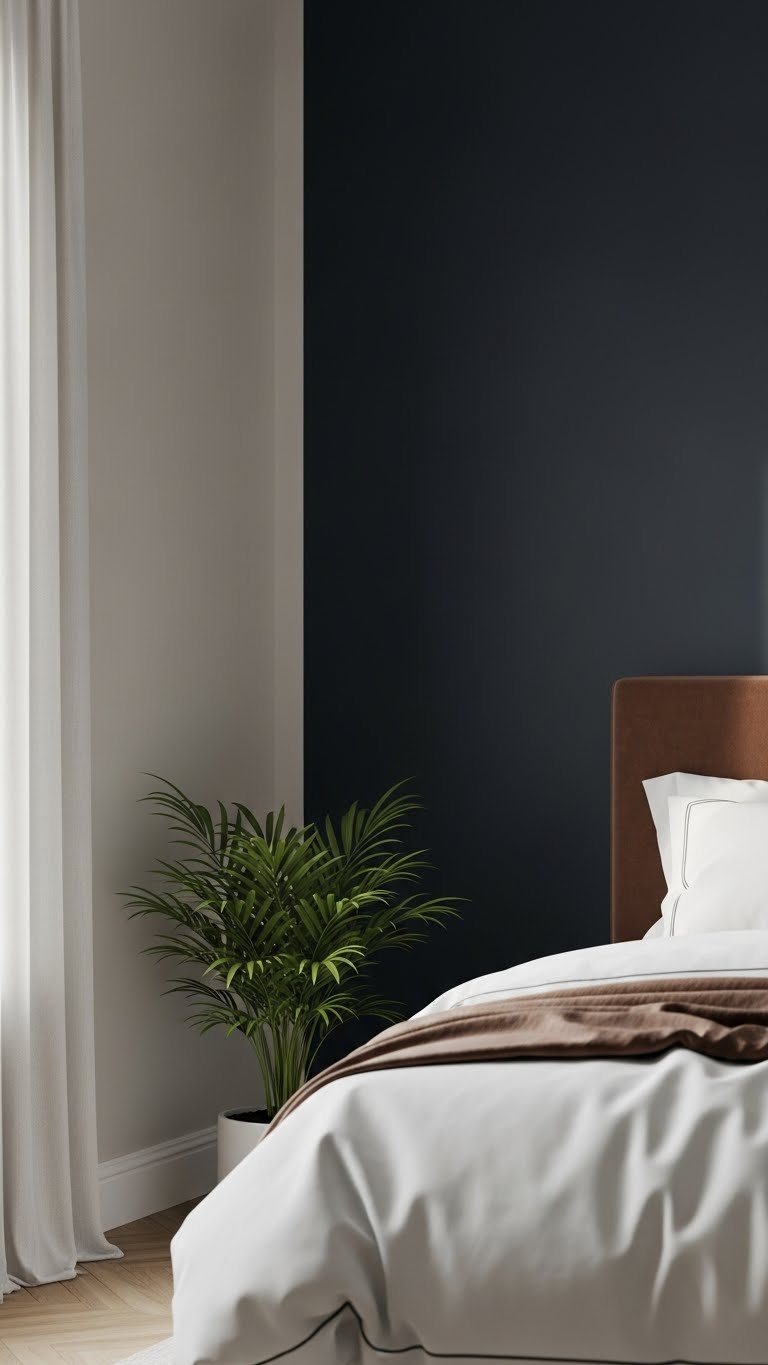 You’ll create moody contrast by limiting the dark area, pairing it with airy neutrals and crisp bedding. Practice textile restraint: choose one luxe fabric for a headboard or throw, keeping lines clean so the look feels liberated and hotel‑crafted.
