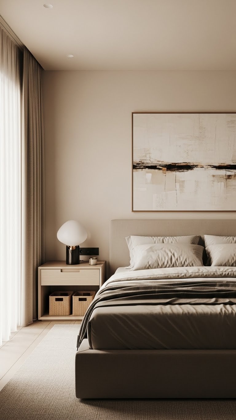 You’ll favor spacious artwork, a sculptural lamp, and minimalist symmetry to create breathing room. Edit ruthlessly, store selectively, and let each element feel intentional so your bedroom feels luxuriously free and effortless.