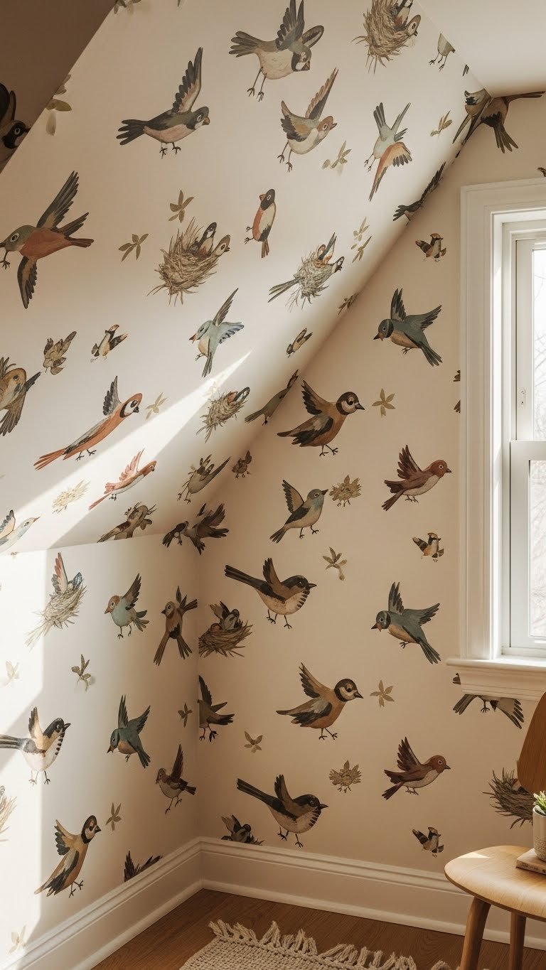 Whimsical Bird Wallpaper Wraps Angled Walls