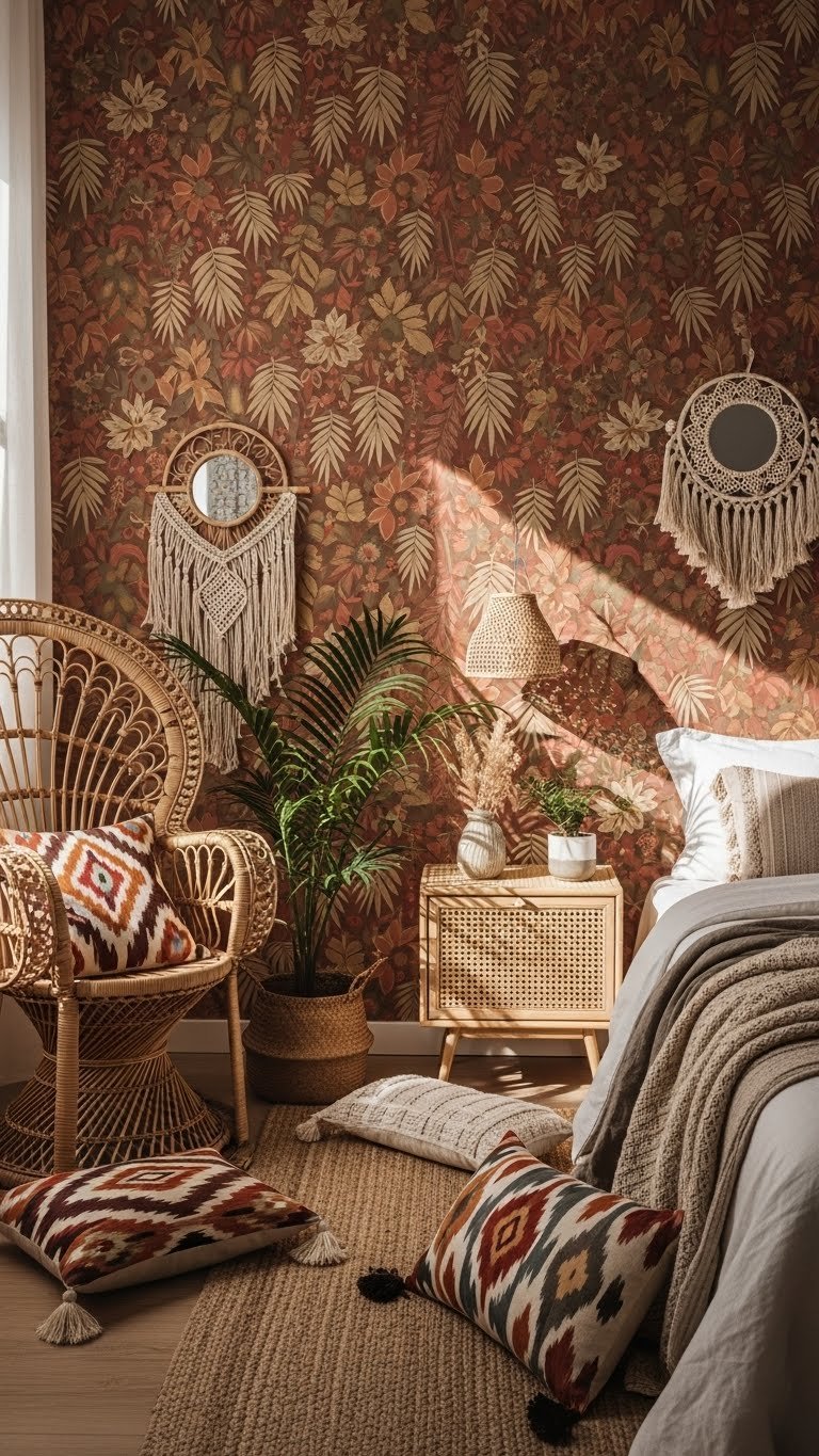 When you wrap a bedroom wall in patterned boho floral or leaf wallpaper, the room instantly feels grounded and gently layered—think oversized, hand-drawn blooms or trailing palms in warm, earthy tones that read like a lived-in textile.
