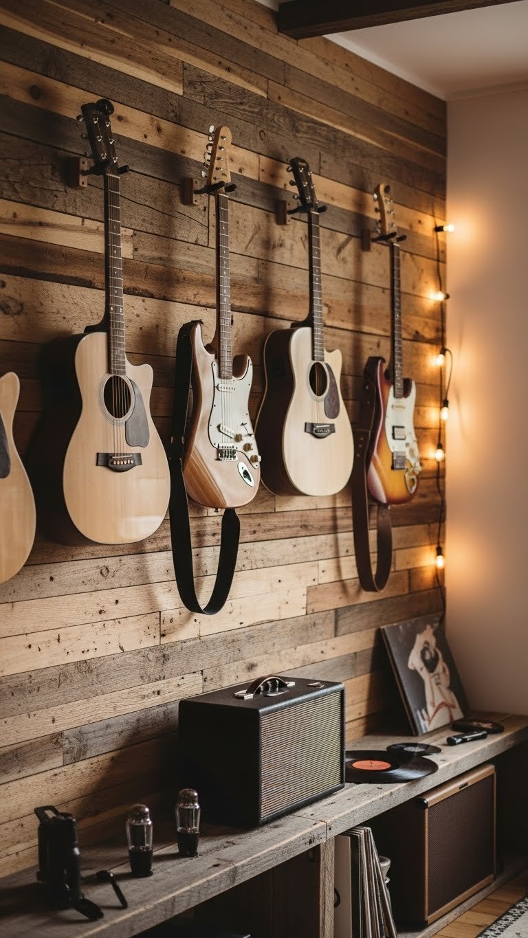If you want to shift from the soft, woven calm of grass cloth to something with more character, a reclaimed wood accent wall with mounted guitars offers rustic warmth and curated personality.