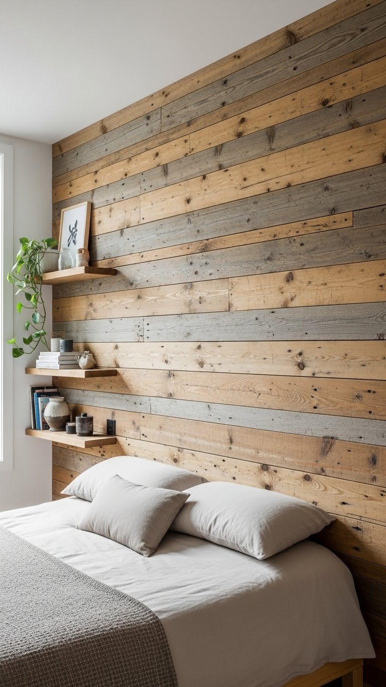 Layer salvaged pine planks across your master wall to create a warm, textured focal point that feels lived‑in and intentional. You’ll admire the weathered texture and natural grain while choosing plank alignment to enhance room width or height. Seal lightly to preserve patina, fasten securely, and pair with minimal bedding and open shelving so the wall feels freeing, not cluttered.