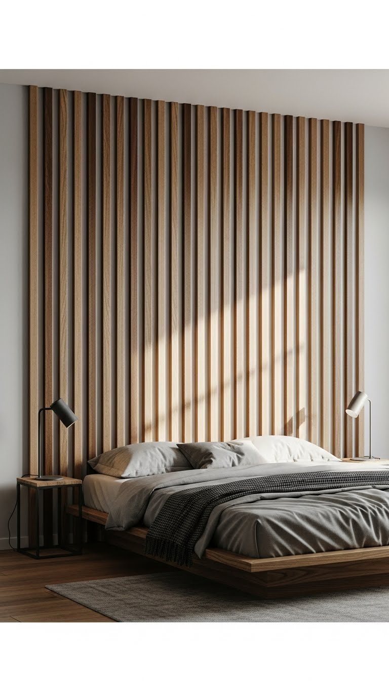 Think of alternating shade slats as a rhythmic headboard that plays with depth and light to give your bed a tailored, gallery-like focus. You’ll arrange ombre slat panels in graduated tones, pairing warm and cool finishes to emphasize contrasting grains. Mount them close together for texture without bulk, paint the wall behind for pop, and let the design feel liberated yet intentionally composed.