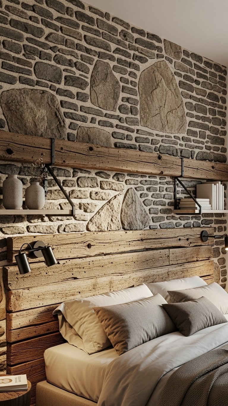 Pairing locally quarried stone with aged wood planks brings a tactile, lived-in elegance to your bedroom wall, grounding the space with natural textures that read both rugged and refined. You’ll layer mortar textures between stones, mount reclaimed beams with hand hewn edges, and secure floating shelves using iron brackets. The result feels free, intentional, and quietly monumental without fuss.