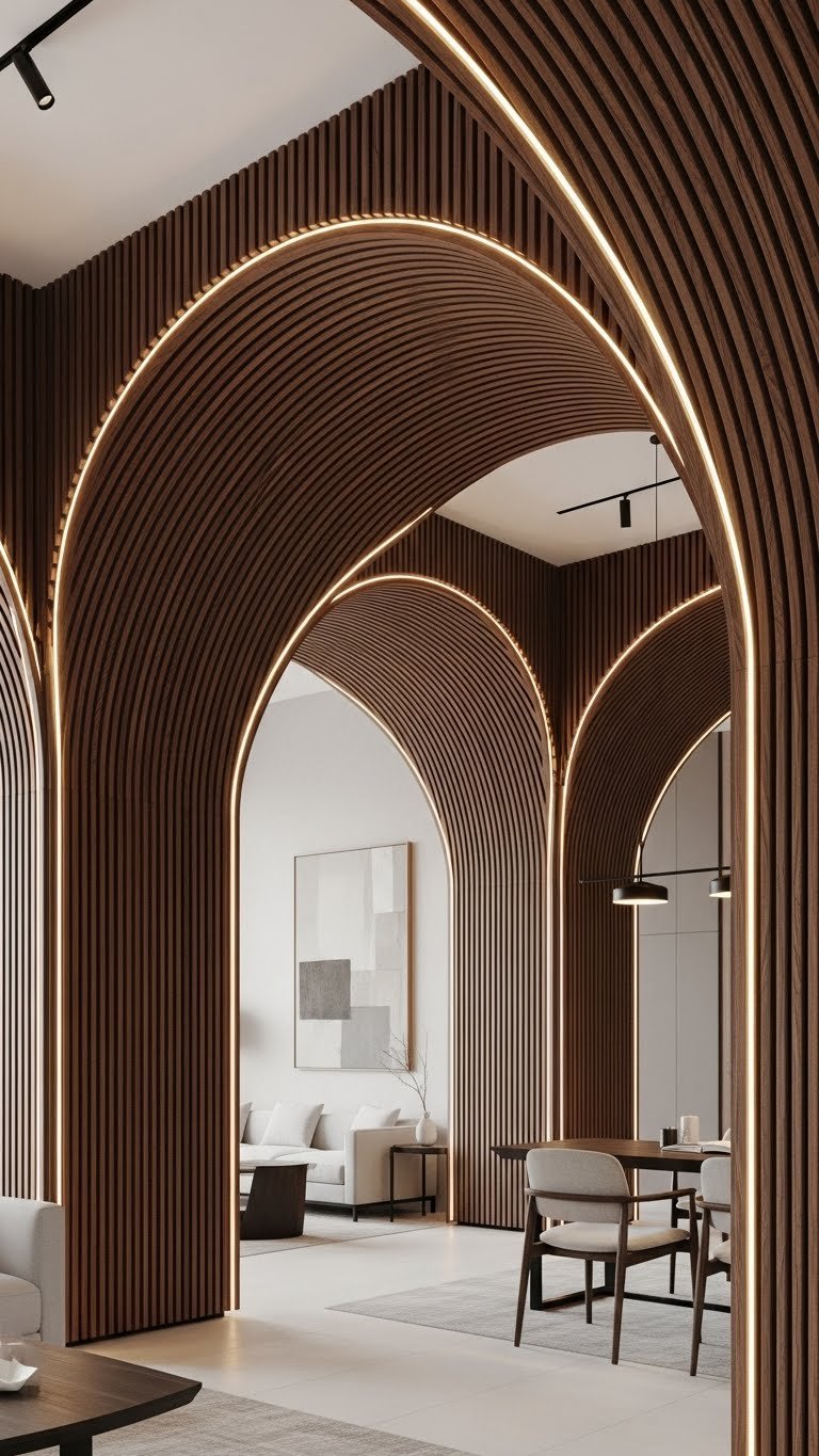 You’ll use curved paneling to emphasize flow, pairing walnut ribbing with soft lighting to celebrate shape. Install slats following the arc for a liberated, tactile backdrop that feels both refined and inviting.