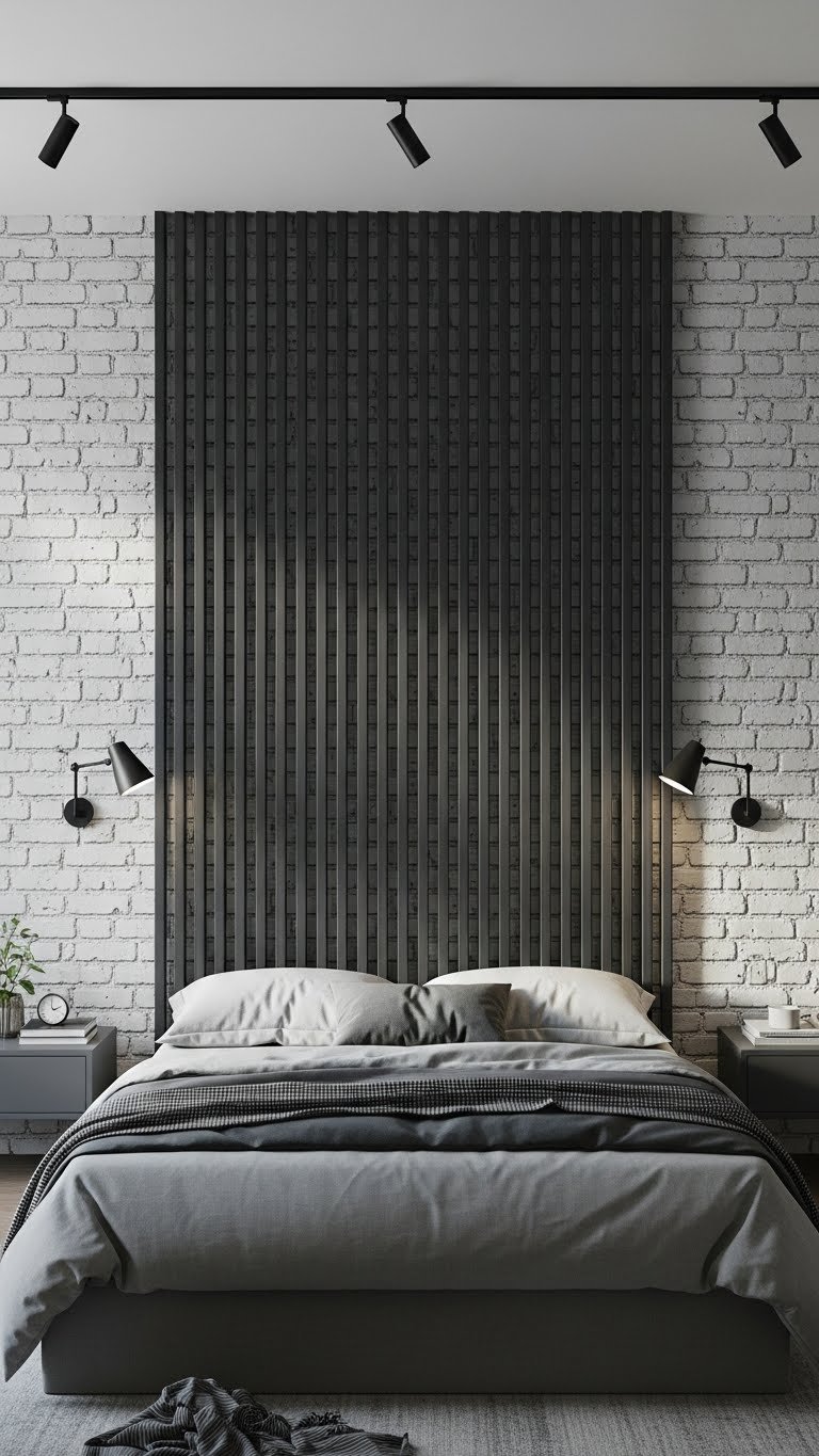 A tactile backdrop of painted brick gives your bedroom instant character, and adding dark grey slats brings crisp geometry and modern contrast to that raw texture. You’ll use an exposed brickheadboard as a focal, layering charcoal slatwork vertically to frame the bed.