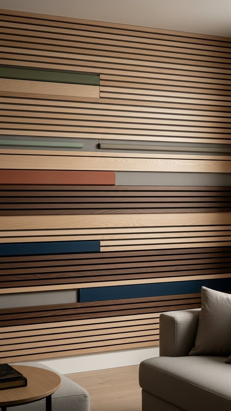 Move from monochrome minimalism to a livelier composition by arranging mixed-wood slats in varying colors and finishes to create wall art that reads like a controlled collage. You can mount hand painted slats alongside raw grains, stagger depths for shadow and rhythm, and integrate slim acoustic panels for sound control. The result feels free, curated, tactile, and cinematic without overwhelming the room.