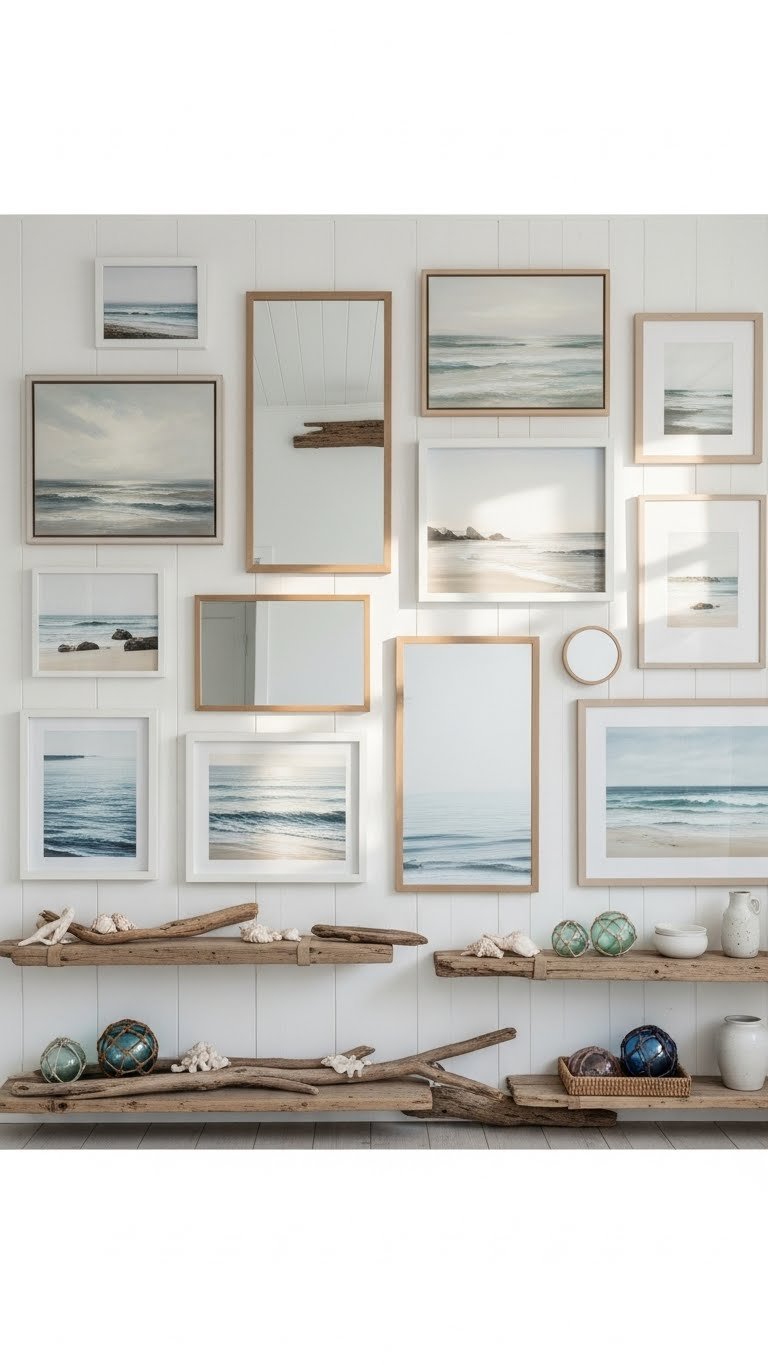 Framed seascapes and strategically placed mirrors will expand light and depth while reinforcing a coastal narrative—hang paintings, prints, and photos at staggered heights and intersperse mirrors with simple frames to echo the water’s shimmer.