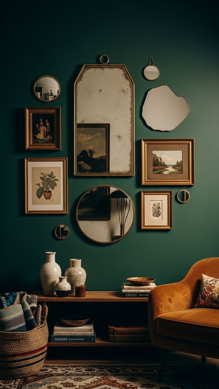 Eclectic Mirror and Artwork Arrangement on Dark Green