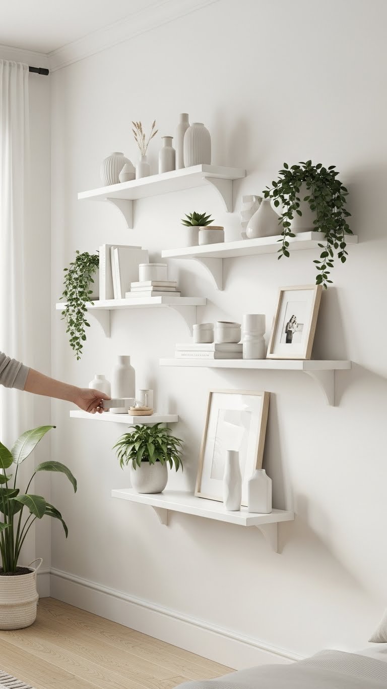 White floating shelves can instantly lift a bedroom’s look while keeping the space feeling light and organized; their clean lines act like quiet frames for your favorite objects.