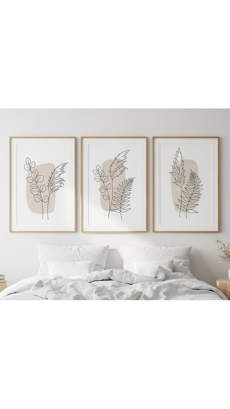 Want a calm, collected focal point that feels timeless? Choose neutral botanical line art that grounds your space with soft silhouettes and muted botanicals. Hang a single large piece or a balanced trio above the bed, keep frames simple, and let negative space breathe. You’ll create a serene, airy vibe that’s effortless, flexible, and perfectly suited to a life that values openness.