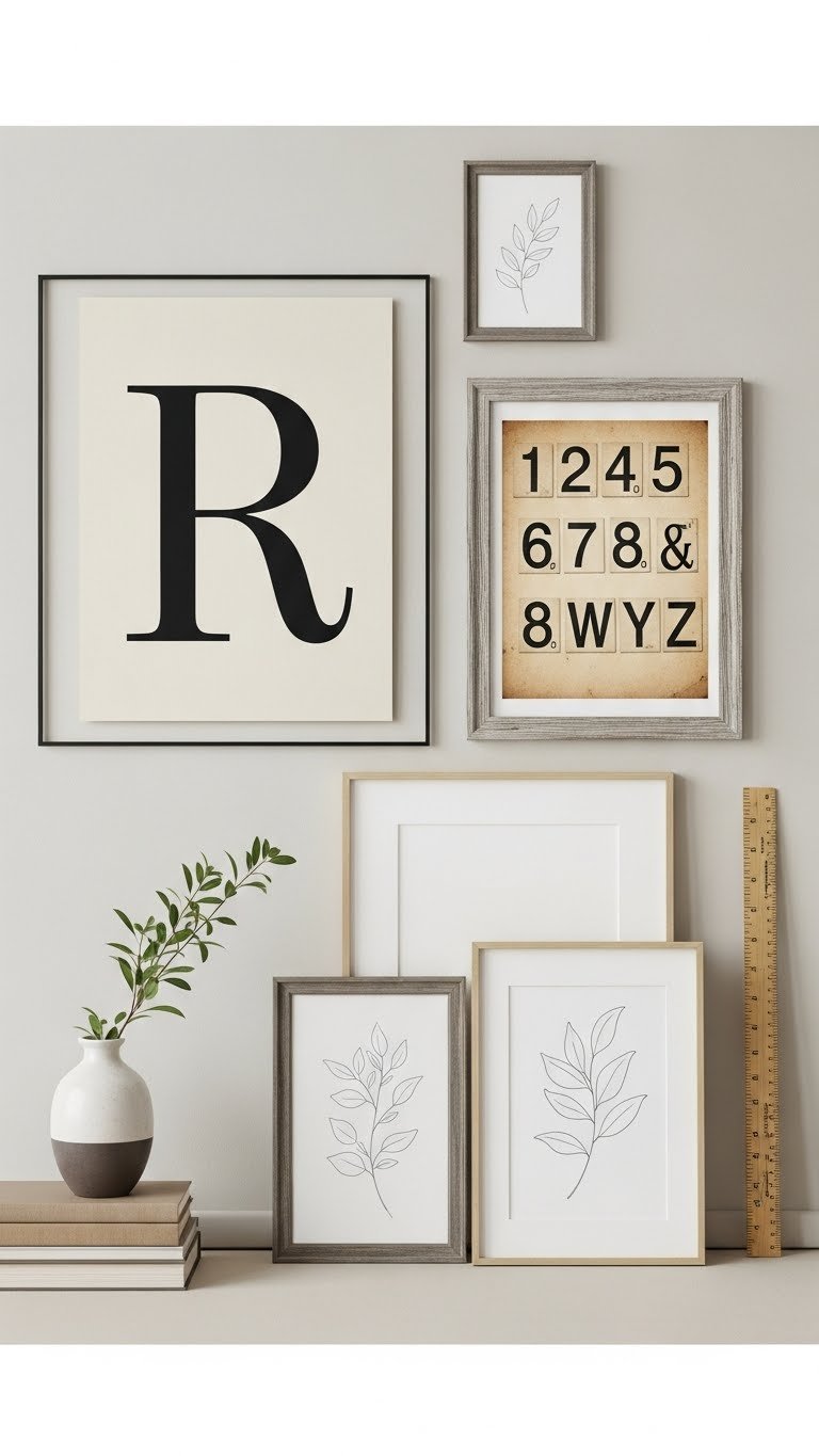 You’ll curate a typographic gallery using oversized initials, numeric anchors, or vintage flashcards, arranging scales and frames to guide the eye. Mix materials, keep spacing deliberate, and let each piece breathe for a liberated, tidy look.