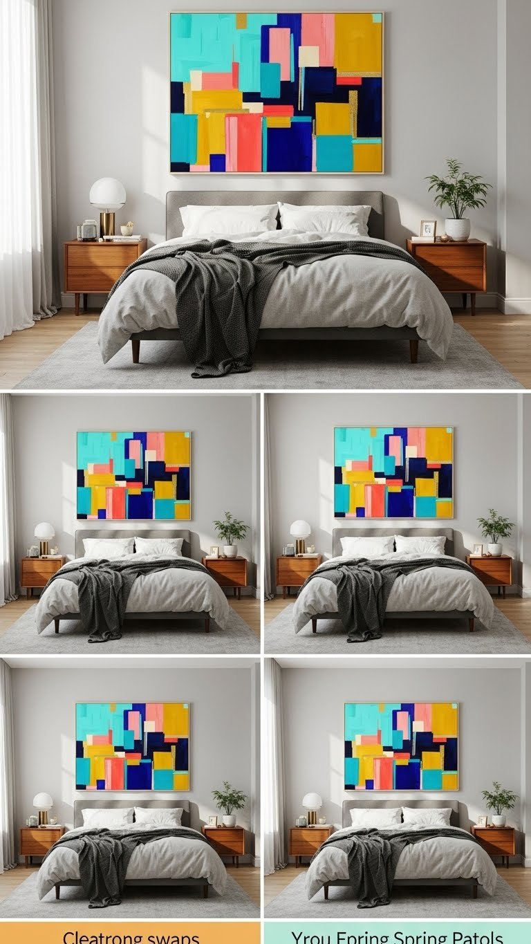 Brighten the room with a colorful abstract print above your bed or dresser to create an immediate focal point that lifts the whole space. Choose pieces with bold brushstrokes and vibrant geometry to energize mornings and calm evenings.