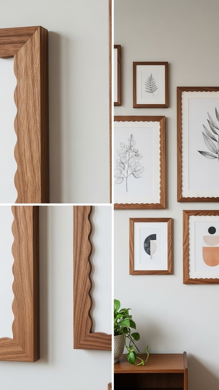 Choose a scalloped walnut frame to give your prints a subtle, sculptural edge that feels both timeless and modern. You’ll appreciate the warm walnut trim paired with a delicate scalloped silhouette that lifts art without overpowering it. Install frames at eye level, mix print sizes for rhythm, and leave breathing space around each piece so your walls feel open, intentional, and free.