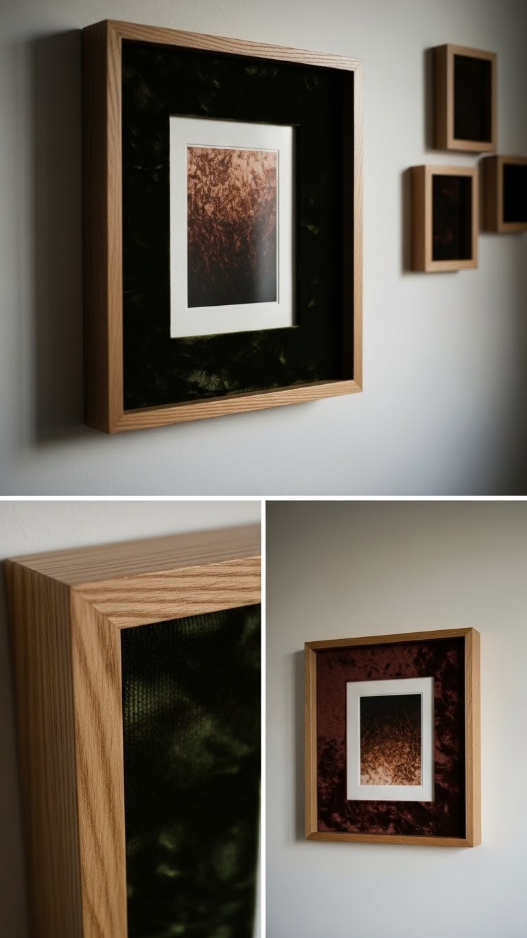 Blending tactile velvet with a shallow oak shadow box turns a simple print into a sculpture you can see and almost feel—so you’ll add depth and warmth without crowding the room.