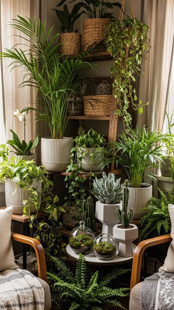 Add miniature terrariums for intimate contrast, tuck ferns in corners, and let growth feel organic—carefree, curated, and boldly personal.