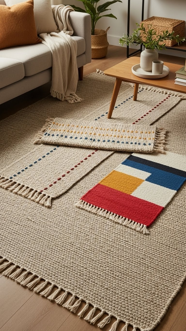 Start by layering woven rugs to instantly add depth and texture to your space; stacked rugs give you visual interest without a major overhaul. You’ll mix hand stitched runners with larger pieces, embrace color block layering for bold contrast, and keep arrangements relaxed yet intentional.