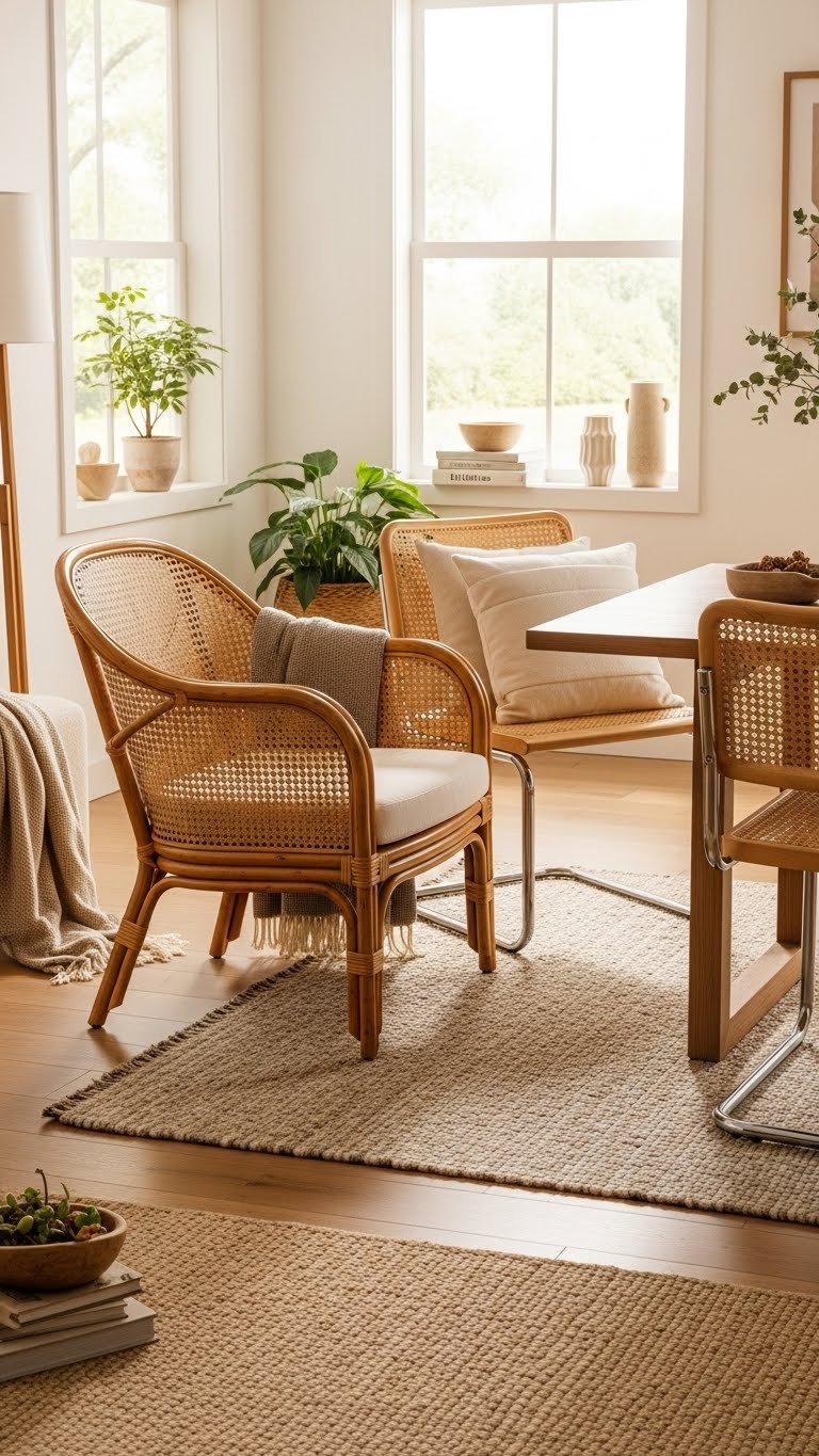 Often you’ll find that mixing rattan and cane seating instantly warms a room while keeping it airy and modern; pair a curved rattan armchair with a sleek cane-back dining chair to balance texture and silhouette. Embrace the rattan revival with varied finishes, layer cushions for cane comfort, and keep lines clean. You’ll create a relaxed, free-spirited space that feels effortless and lived-in.