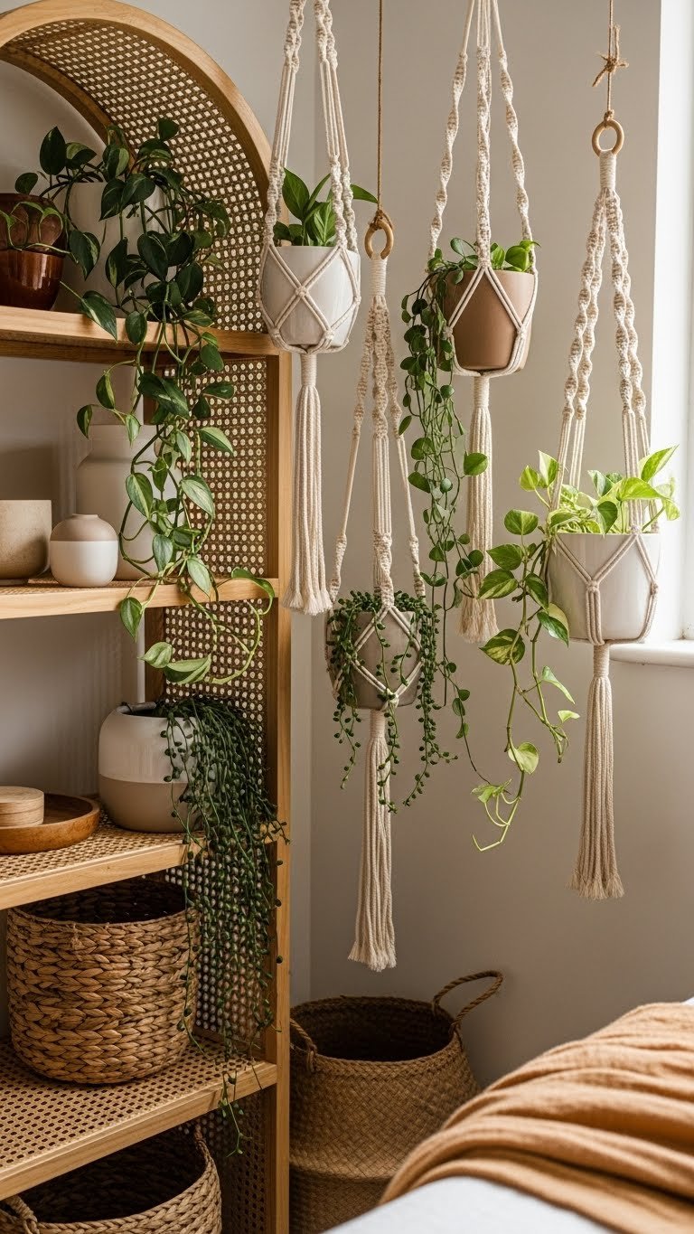 Embrace boho macramé pieces and hanging planters to elevate corners, stairways, or over a bed.