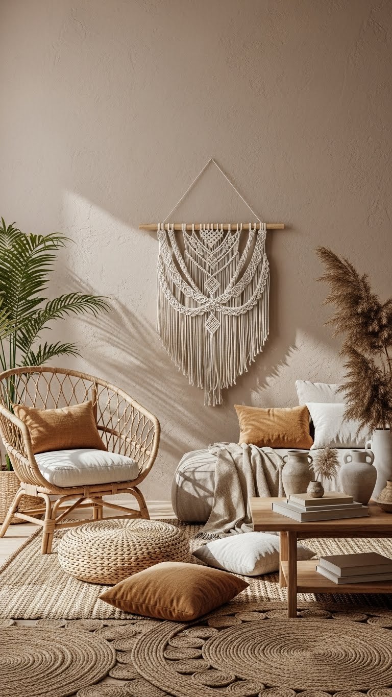 After mixing rattan and cane to layer texture, add macramé wall hangings and plant holders to bring handcrafted softness and vertical interest to your space.