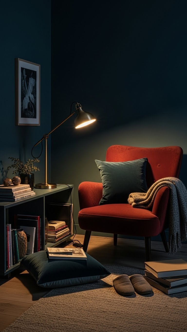 When you carve out a deep-colored reading corner, think of it as a jewel within your room that invites lingering—choose a rich, enveloping hue like indigo, forest green, or oxblood for walls or upholstery, then layer in tactile accents (velvet cushion, wool throw, matte brass lamp) to heighten warmth and depth without overwhelming the space. Anchor with a velvet reading chair and a moody bookshelf; add focused lighting and barefoot comfort.