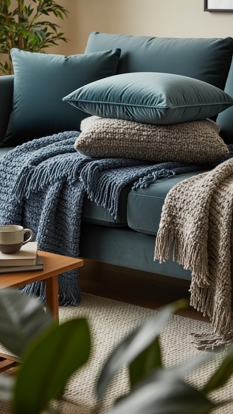 Often you’ll pair plush velvet with nubby wool throws to balance luxe sheen and tactile grit, creating a layered look that feels both sophisticated and lived-in.