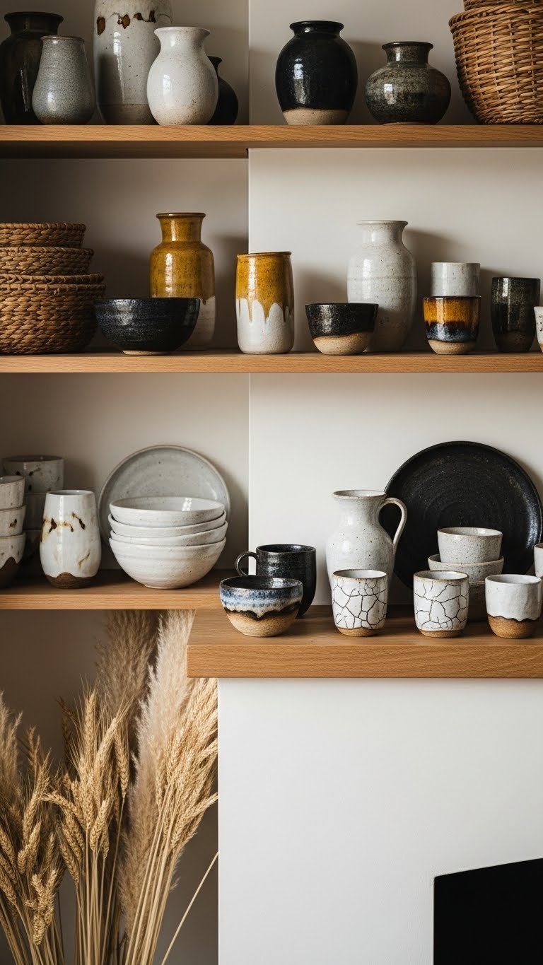 Showcase artisanal ceramics and pottery on open shelving or a low mantel to let their handmade imperfections become focal points. You’ll mix shapes, sizes, and matte glaze contrasts to create relaxed visual rhythm.