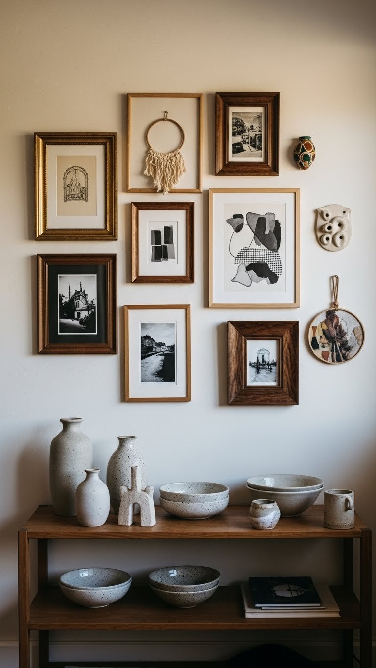 After arranging your ceramics as a tactile anchor, use a collected gallery wall to extend that layered, personal vibe up the wall—mix art, photos, textiles, and small sculptural pieces so each element echoes the handmade feel below.