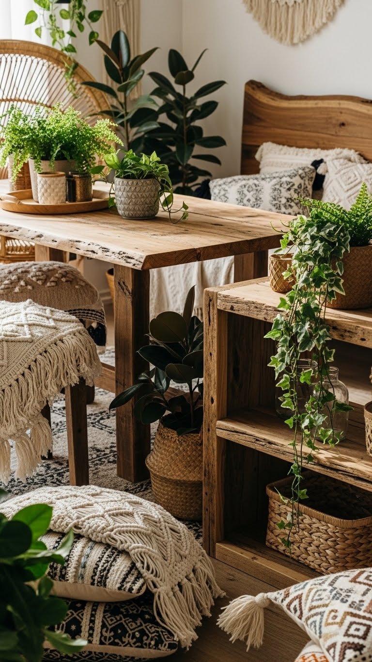 Bring reclaimed wood into your space to anchor the boho look with history and texture; its weathered grain and imperfect edges add warmth and a lived-in authenticity that’s both sustainable and on-trend.