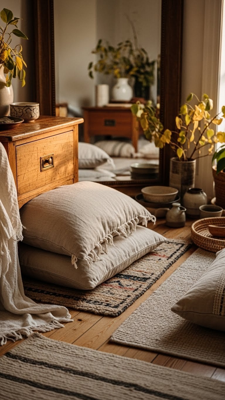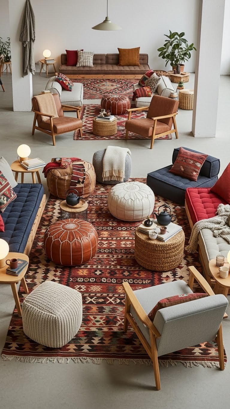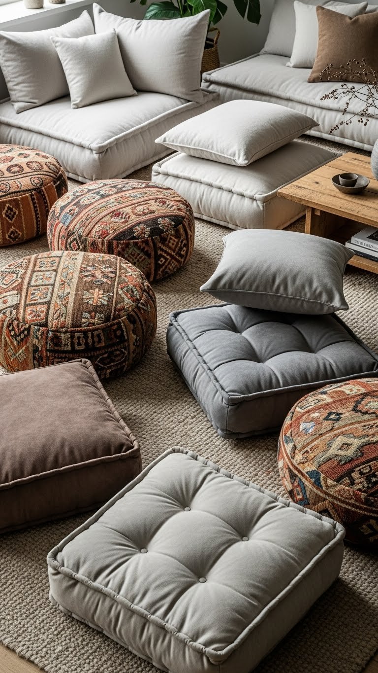 Mix in a handful of floor cushions and poufs to instantly soften seating areas and invite casual lounging; you’ll want varied shapes, sizes, and textures—think round kilim poufs, oversized linen cushions, and low-slung suede floor pillows—to create an informal, layered look.