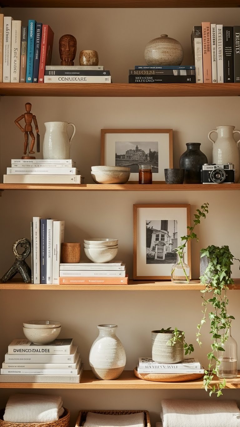 Layer your open shelves with a curated mix of everyday objects and meaningful finds so they feel personal, not staged—you’ll want a balance of books, ceramics, framed photos, and one or two sculptural pieces to give each shelf personality.