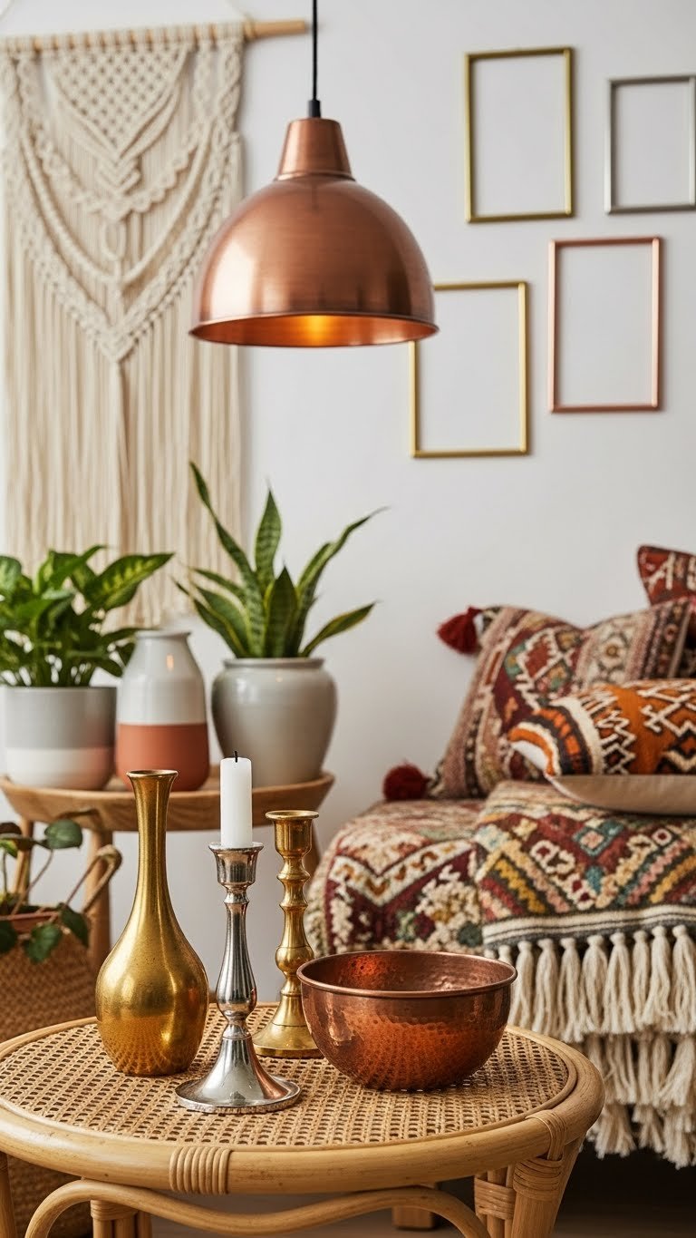 Often a few well-placed metal pieces are all you need to give a boho room subtle polish without erasing its relaxed vibe. You’ll mix warm brass, cool nickel and aged copper sparingly, using contrasting finishes to create depth. Keep metal to focal points—lighting, frames or a small accent grouping—so the look feels curated, free, and effortlessly collected.